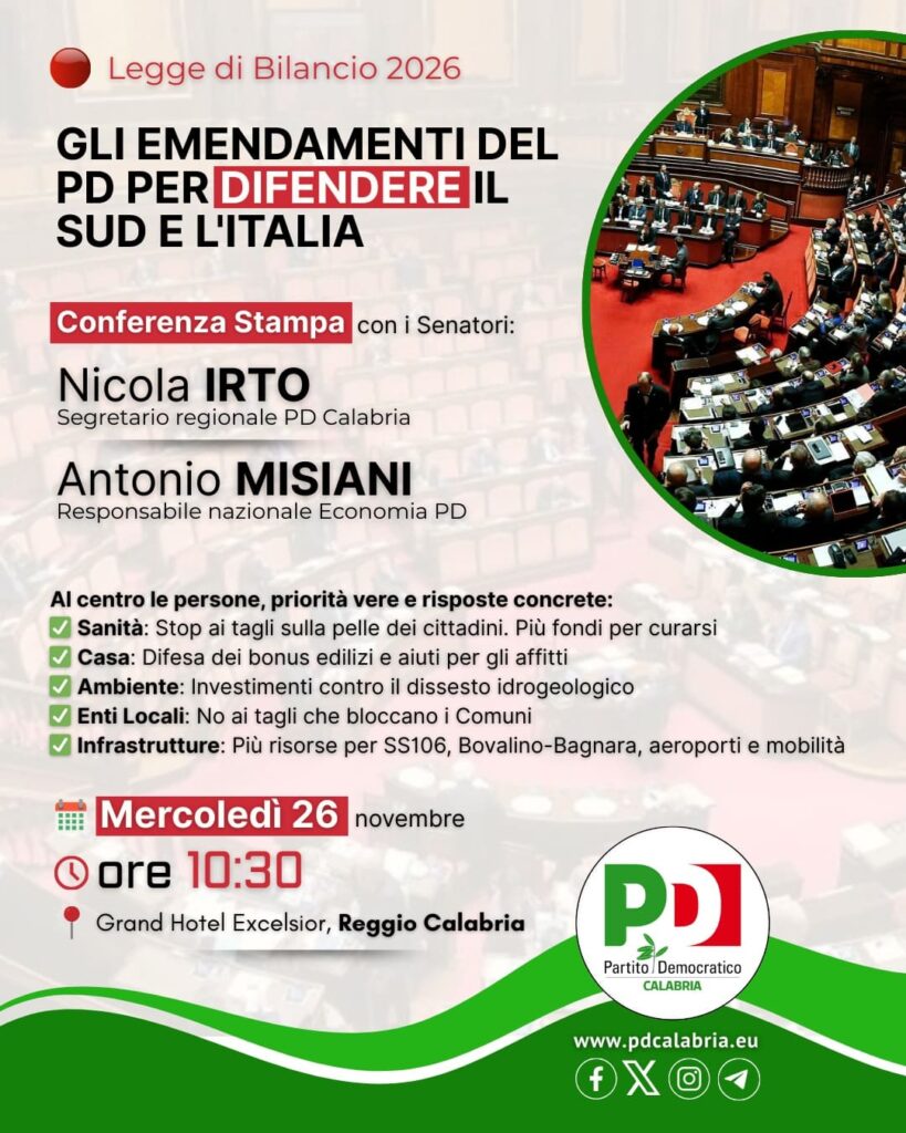 Mercoledì 26 novembre, alle ore 10.30, al Grand Hotel Excelsior di Reggio Calabria, il Partito Democratico presenterà alla stampa gli emendamenti depositati al Senato in occasione dell’esame della legge di Bilancio.